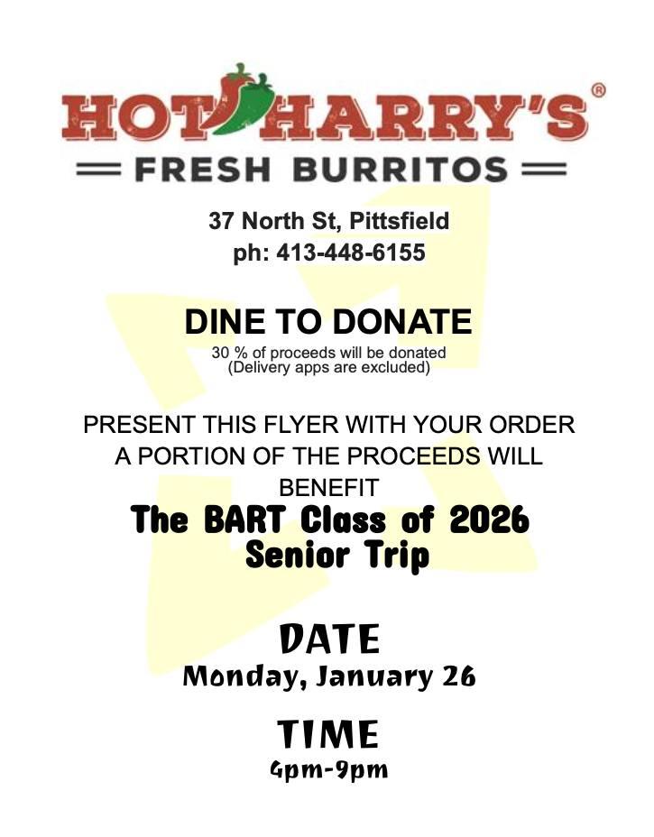Eat yummy food and support the BART Seniors as they fundraise for their Class Trip! Join us at Hot Harry's on North Street in Pittsfield on Monday, January 26, from 4:00 PM to 9:00 PM. Hot Harry's will donate 30% of proceeds to our seniors. Delivery app orders excluded. You must present the event flyer with your order for BART to receive the donation. [Flyer]