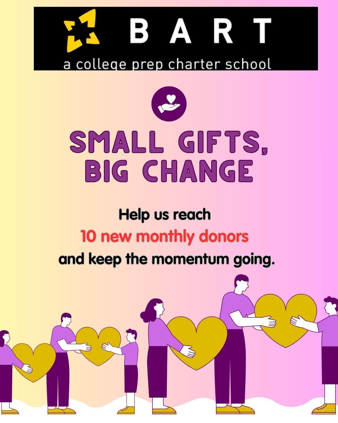 Inspired by Giving Tuesday, you can still help power BART’s work all year long by becoming a sustaining monthly donor. Help us reach our goal of 10 new sustaining donors by giving at a level that’s meaningful to you—$5, $25, or $100. Your monthly gift strengthens programs, lifts student experiences, and keeps our mission moving forward. [Support BART today]